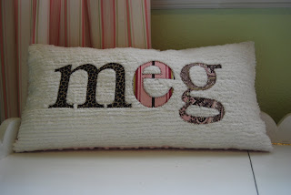 These applique name pillows have been a big hit! They're a great way to personalize a bedroom, and make a cute baby shower gift as well. These two feature a fuzzy chenille on the front and soft minky dot on the back, but any kind of fabric will work to make it fully reversible. Also available in a square size. Applique name pillow - $25.00